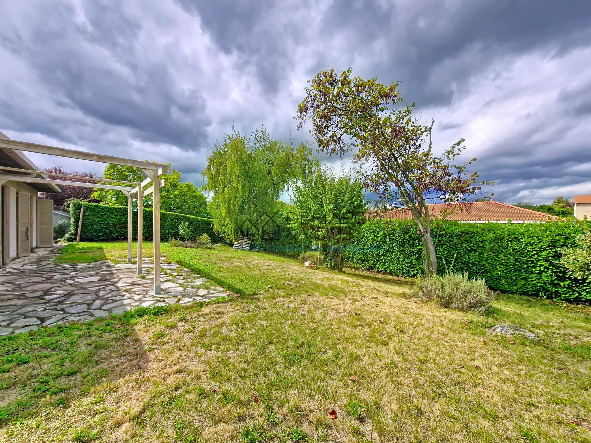 Bâtie sur un terrain plat de 650 m² avec du jardin des 2 côtés de la maison, vous profiterez au choix, de l'ombre ou du soleil toute la journée.